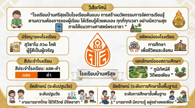 “โรงเรียนบ้านศรีสุขเป็นโรงเรียนต้นแบบ การสร้างนวัตกรรมการจัดการเรียนรู้ ตามความต้องการของผู้เรียน ได้เรียนรู้ด้วยตนเอง ทุกที่ทุกเวลา อย่างมีความสุข ภายใต้แนวทางศาสตร์พระราชา ”