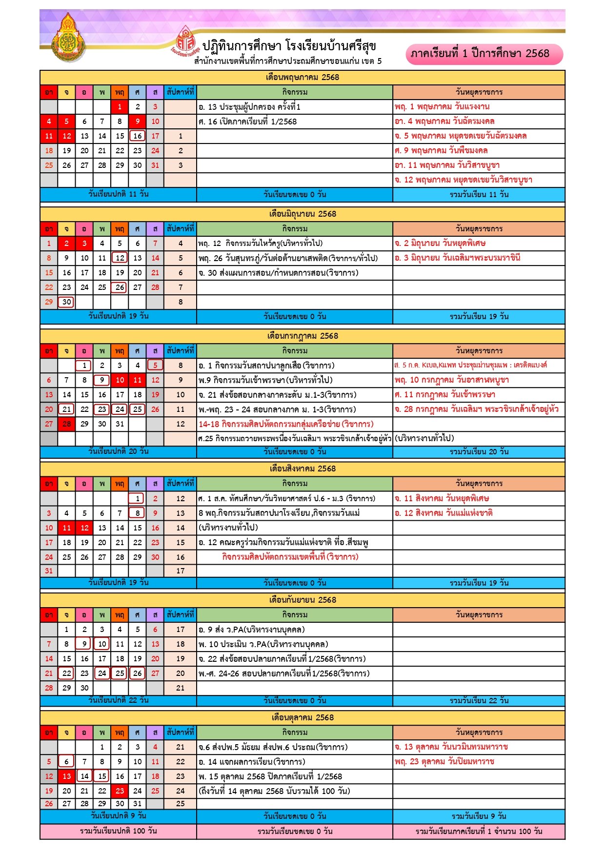 ปฏิทินกิจกรรม ปีการศึกษา 1/2568