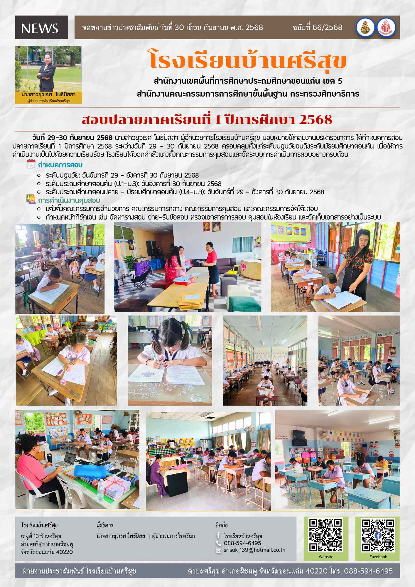 วันที่ 29-30 กันยายน 2568 นางสาวยุวเรศ โพธิปัสสา ผู้อำนวยการโรงเรียนบ้านศรีสุข มอบหมายให้กลุ่มงานบริหารวิชาการ ได้กำหนดการสอบปลายภาคเรียนที่ 1 ปีการศึกษา 2568 ระหว่างวันที่ 29 – 30 กันยายน 2568 ครอบคลุมตั้งแต่ระดับปฐมวัยจนถึงระดับมัธยมศึกษาตอนต้น เพื่อให้การดำเนินงานเป็นไปด้วยความเรียบร้อย โรงเรียนได้ออกคำสั่งแต่งตั้งคณะกรรมการคุมสอบและจัดระบบการดำเนินการสอบอย่างครบถ้วน