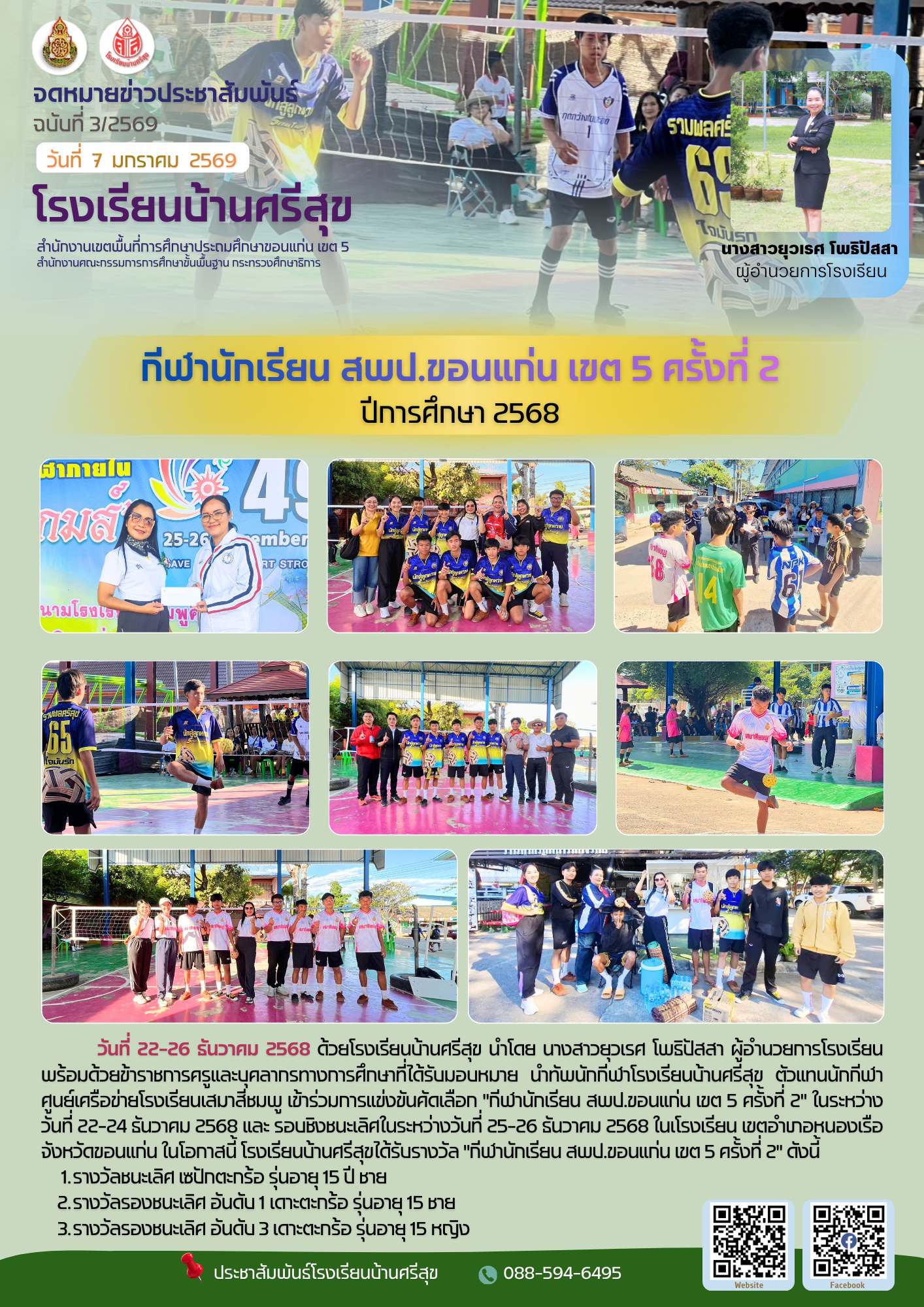 วันที่ 22-26 ธันวาคม 2568 ด้วยโรงเรียนบ้านศรีสุข นำโดย นางสาวยุวเรศ โพธิปัสสา ผู้อำนวยการโรงเรียน พร้อมด้วยข้าราชการครูและบุคลากรทางการศึกษาที่ได้รับมอบหมาย นําทัพนักกีฬาโรงเรียนบ้านศรีสุข ตัวแทนนักกีฬาศูนย์เครือข่ายโรงเรียนเสมาสีชมพู เข้าร่วมการแข่งขันคัดเลือก "กีฬานักเรียน สพป.ขอนแก่น เขต 5 ครั้งที่ 2" ในระหว่างวันที่ 22-24 ธันวาคม 2568 และ รอบชิงชนะเลิศในระหว่างวันที่ 25-26 ธันวาคม 2568 ในเโรงเรียน เขตอําเภอหนองเรือ จังหวัดขอนแก่น ในโอกาสนี้ โรงเรียนบ้านศรีสุขได้รับรางวัล "กีฬานักเรียน สพป.ขอนแก่น เขต 5 ครั้งที่ 2" ดังนี้