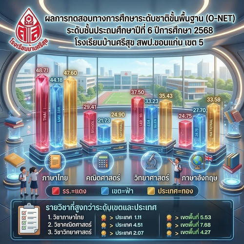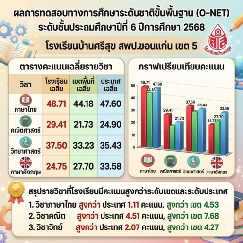 สรุปผลการทดสอบ O-NET ชั้นประถมศึกษาปีที่ 6 ปีการศึกษา 2568 โรงเรียนบ้านศรีสุข