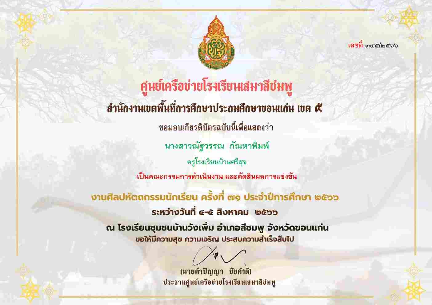ชื่อผลงาน : เป็นคณะกรรมการดำเนินงาน และตัดสินผลการแข่งขัน งานศิลปหัตถกรรมนักเรียน ครั้งที่ 71 ประจำการศึกษา 2566