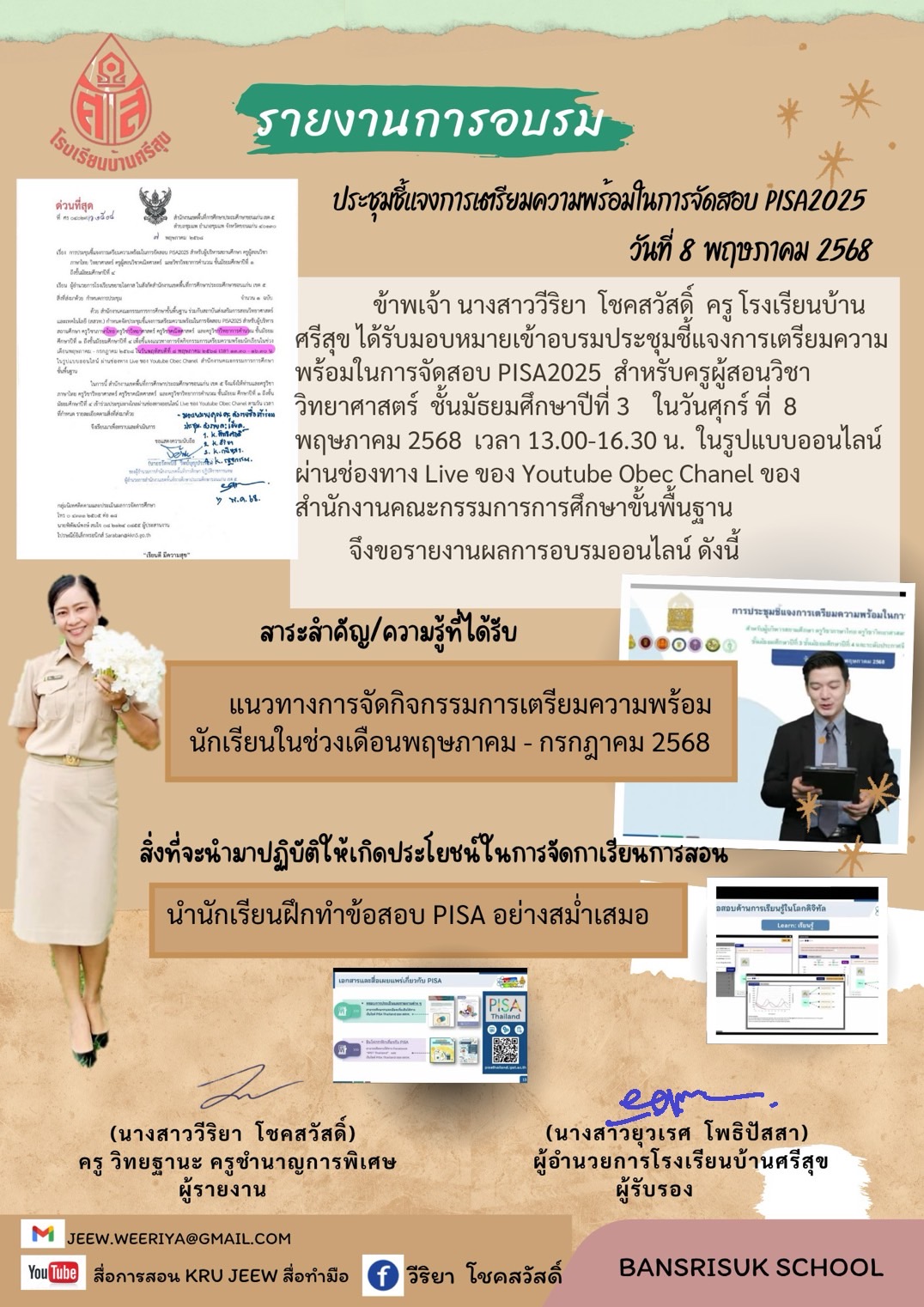 ข้าพเจ้า นางสาววีริยา โชคสวัสดิ์ ครู โรงเรียนบ้านศรีสุข ได้รับมอบหมายเข้าอบรมประชุมชี้แจงการเตรียมความพร้อมในการจัดสอบ PISA2025 สำหรับครูผู้สอนวิชาวิทยาศาสตร์ ชั้นมัธยมศึกษาปีที่ 3 ในวันศุกร์ ที่ 8 พฤษภาคม 2568 เวลา 13.00-16.30 น. ในรูปแบบออนไลน์ผ่านช่องทาง Live ของ Youtube Obec Chanel ของสำนักงานคณะกรรมการการศึกษาขั้นพื้นฐาน |
