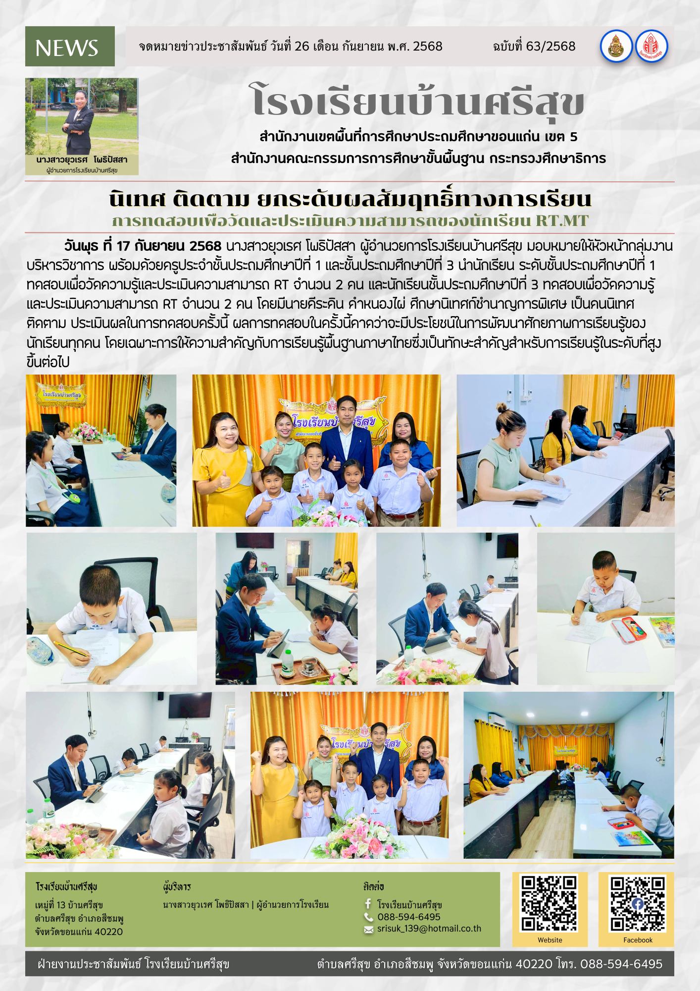วันพุธ ที่ 17 กันยายน 2568 นางสาวยุวเรศ โพธิปัสสา ผู้อำนวยการโรงเรียนบ้านศรีสุข มอบหมายให้หัวหน้ากลุ่มงานบริหารวิชาการ พร้อมด้วยครูประจำชั้นประถมศึกษาปีที่ 1 และชั้นประถมศึกษาปีที่ 3 นํานักเรียน ระดับชั้นประถมศึกษาปีที่ 1 ทดสอบเพื่อวัดความรู้และประเมินความสามารถ RT จํานวน 2 คน และนักเรียนชั้นประถมศึกษาปีที่ 3 ทดสอบเพื่อวัดความรู้ และประเมินความสามารถ RT จํานวน 2 คน โดยมีนายคีระคิน คำหนองไผ่ ศึกษานิเทศก์ชํานาญการพิเศษ เป็นคนนิเทศ ติดตาม ประเมินผลในการทดสอบครั้งนี้ ผลการทดสอบในครั้งนี้คาดว่าจะมีประโยชน์ในการพัฒนาศักยภาพการเรียนรู้ของนักเรียนทุกคน โดยเฉพาะการให้ความสำคัญกับการเรียนรู้พื้นฐานภาษาไทยซึ่งเป็นทักษะสำคัญสำหรับการเรียนรู้ในระดับที่สูงขึ้นต่อไป |