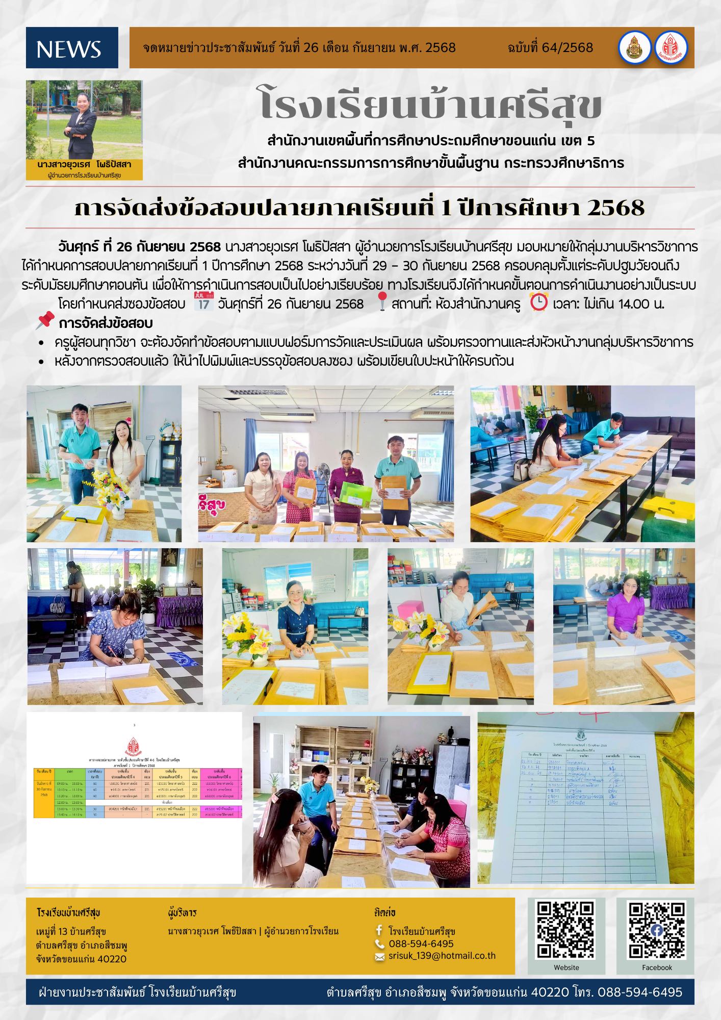 วันศุกร์ ที่ 26 กันยายน 2568 นางสาวยุวเรศ โพธิปัสสา ผู้อำนวยการโรงเรียนบ้านศรีสุข มอบหมายให้กลุ่มงานบริหารวิชาการ ได้กำหนดการสอบปลายภาคเรียนที่ 1 ปีการศึกษา 2568 ระหว่างวันที่ 29 – 30 กันยายน 2568 ครอบคลุมตั้งแต่ระดับปฐมวัยจนถึงระดับมัธยมศึกษาตอนต้น เพื่อให้การดำเนินการสอบเป็นไปอย่างเรียบร้อย ทางโรงเรียนจึงได้กำหนดขั้นตอนการดำเนินงานอย่างเป็นระบบ