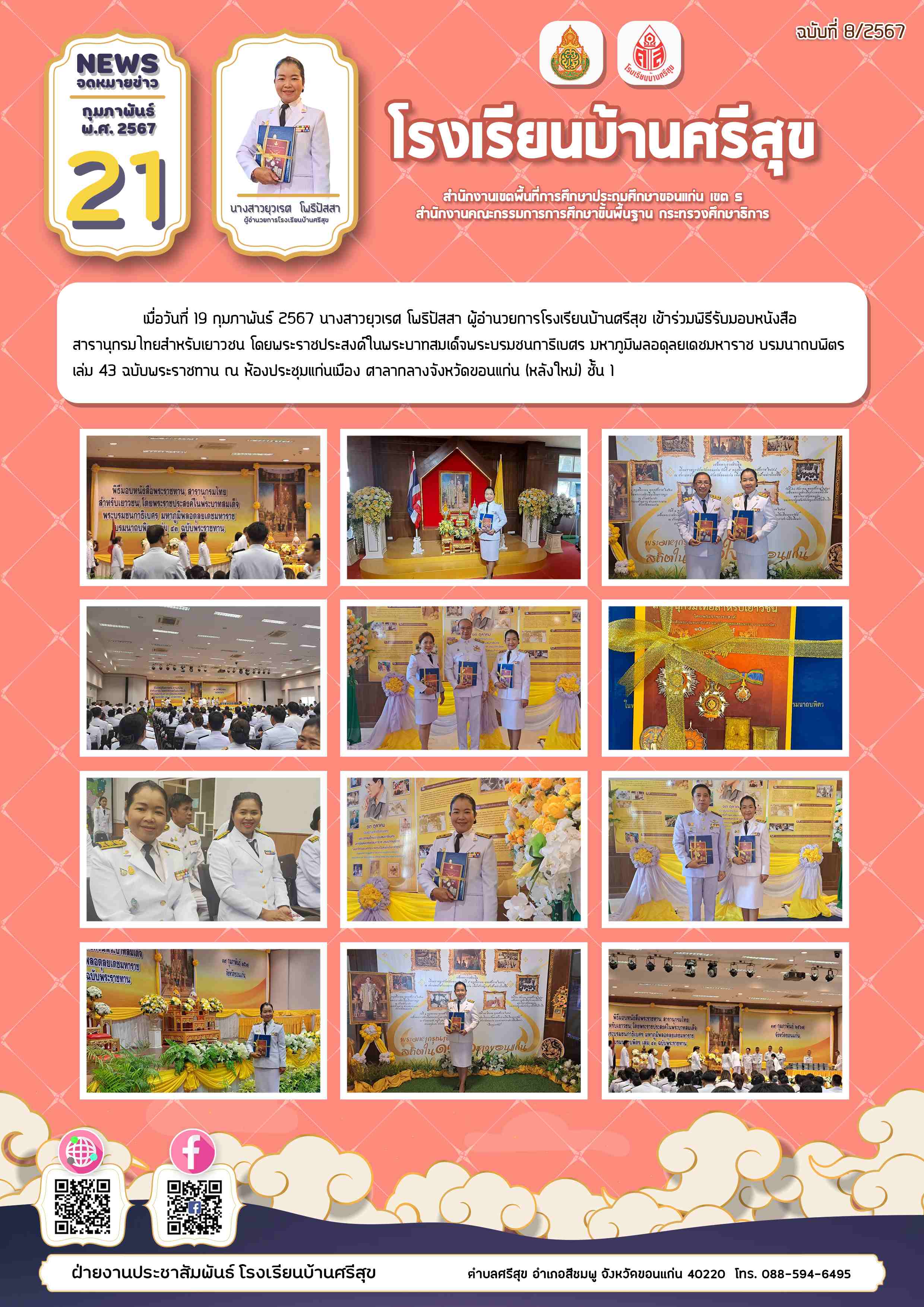 เมื่อวันที่ 19 กุมภาพันธ์ 2567 นางสาวยุวเรศ โพธิปัสสา ผู้อำนวยการโรงเรียนบ้านศรีสุข เข้าร่วมพิธีรับมอบหนังสือ