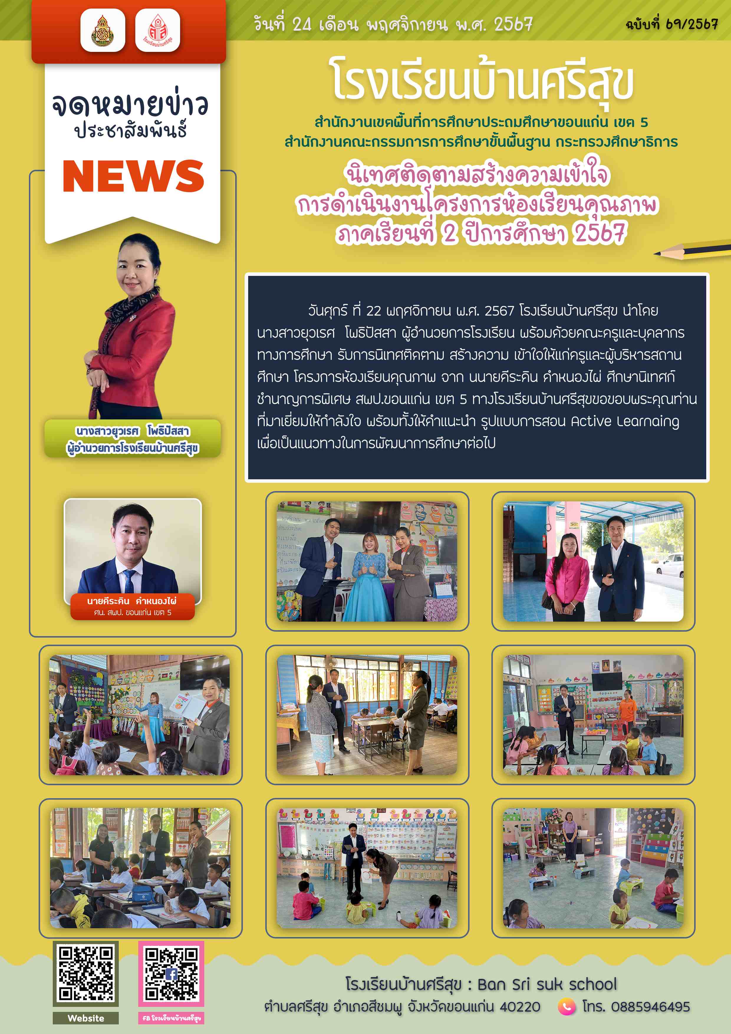 วันศุกร์ ที่ 22 พฤศจิกายน พ.ศ. 2567 โรงเรียนบ้านศรีสุข นําโดย นางสาวยุวเรศ โพธิปัสสา ผู้อํานวยการโรงเรียน พร้อมด้วยคณะครูและบุคลากรทางการศึกษา รับการนิเทศติดตาม สร้างความ เข้าใจให้แก่ครูและผู้บริหารสถานศึกษา โครงการห้องเรียนคุณภาพ จาก
