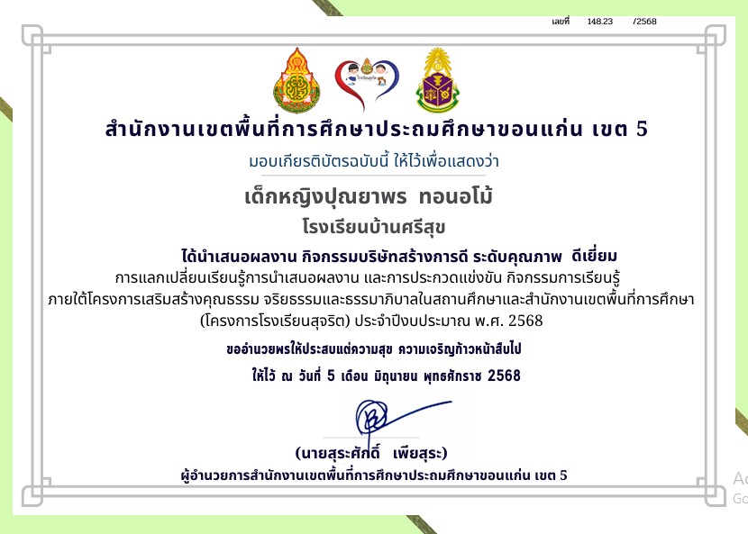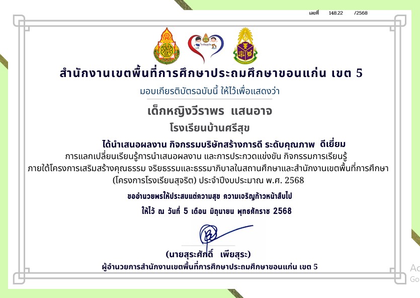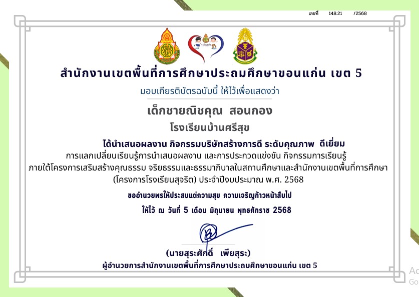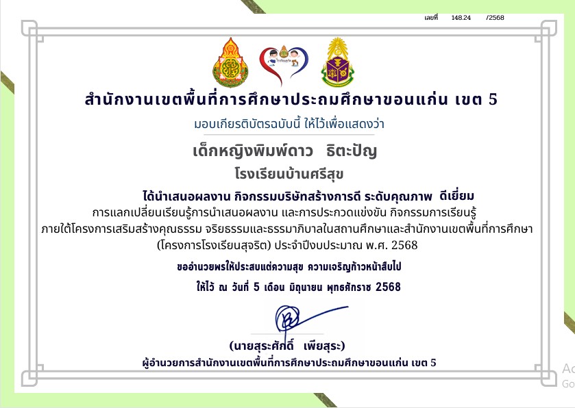 เกียรติบัตร รางวัลโรงเรียนสุจริต กิจกรรมบริษัทสร้างการดี ระดับคุณภาพ ดีมาก