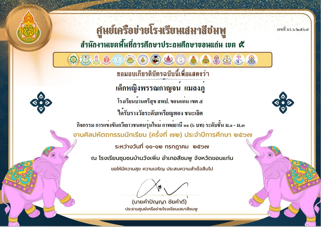 เกียรติบัตรศิลปะหัตกรรมครั้งที่ 72 ระดับศูนย์เครือข่าย กิจกรรมกาพย์ยานี11 ม.1-3