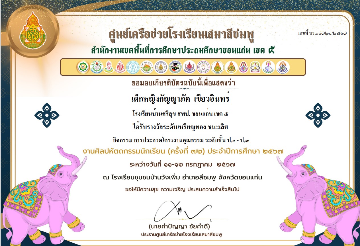 เกียรติบัตรศิลปะหัตกรรมครั้งที่ 72 ระดับศูนย์เครือข่าย กิจกรรมโครงงานคุณธรรม ป.1-3