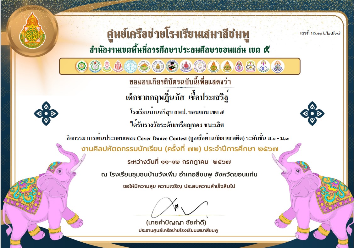 เกียรติบัตรศิลปะหัตกรรมครั้งที่ 72 ระดับศูนย์เครือข่าย กิจกรรมเต้นประกอบเพลง ม.1-3