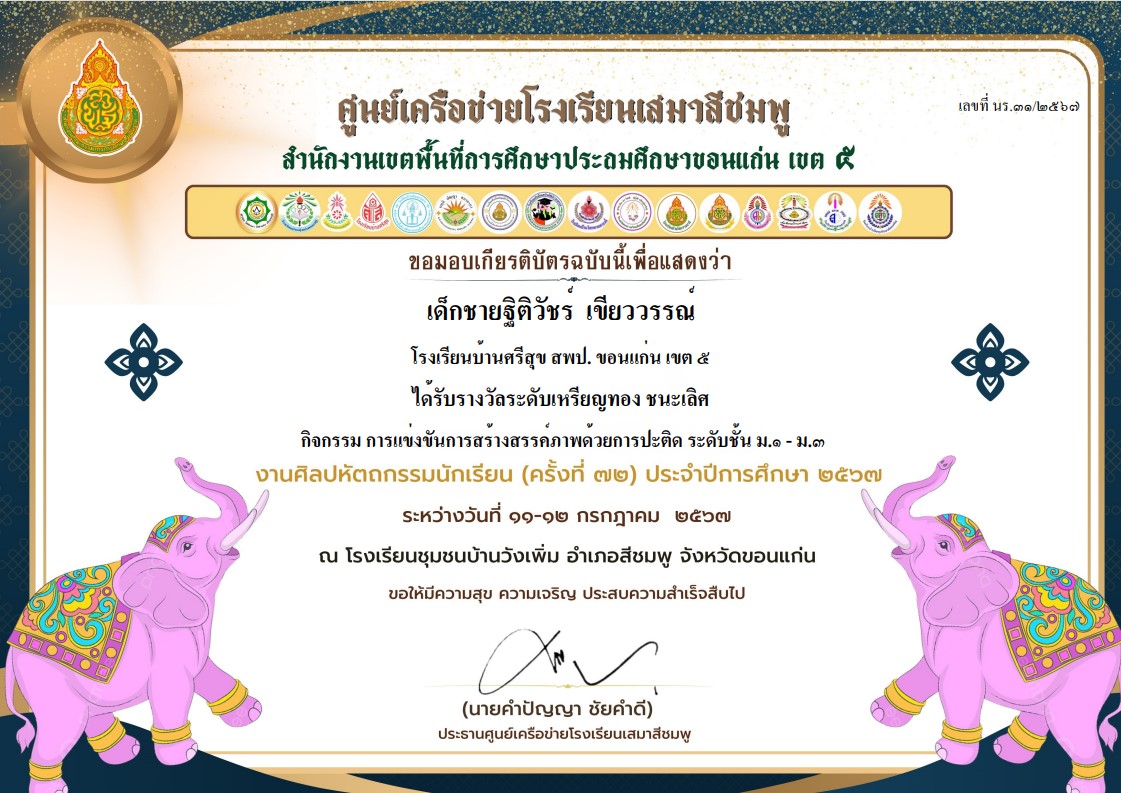 เกียรติบัตรศิลปะหัตกรรมครั้งที่ 72 ระดับศูนย์เครือข่าย กิจกรรมคิดเลขเร็ว ม.1-3