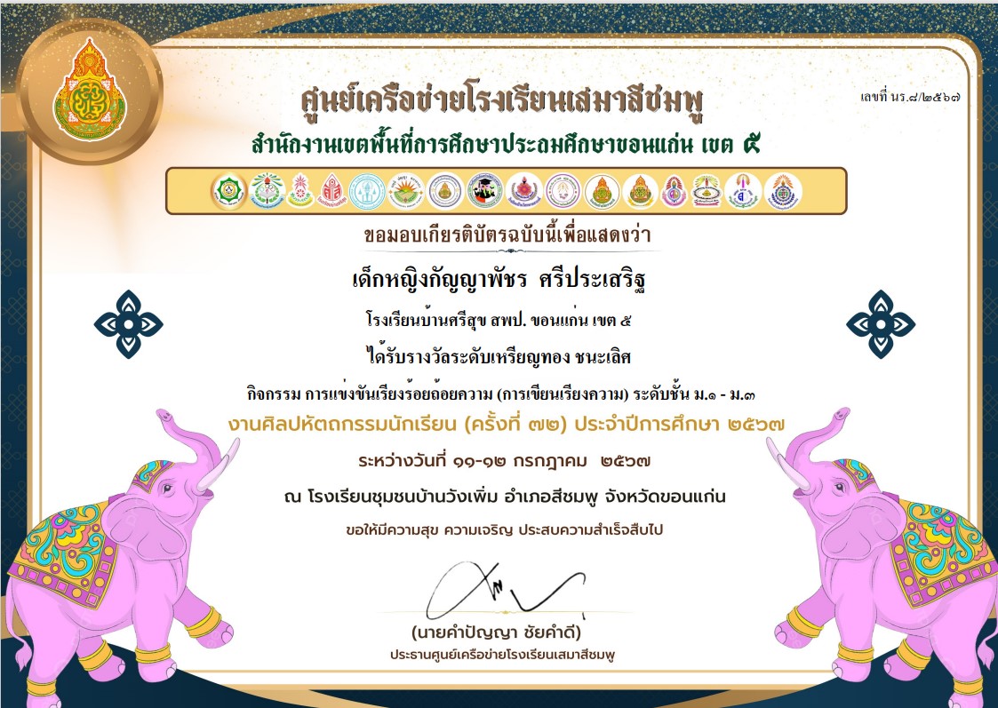 เกียรติบัตรศิลปะหัตกรรมครั้งที่ 72 ระดับศูนย์เครือข่าย กิจกรรมเรียงความ ม.1-3