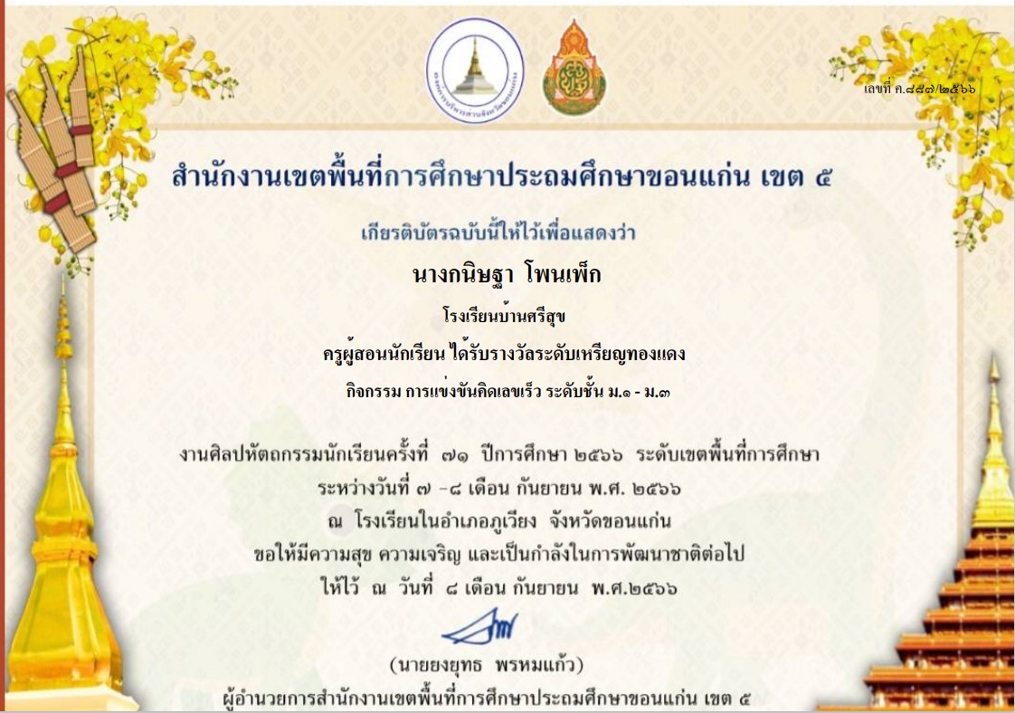 ชื่อผลงาน : ครูผู้สอนนักเรียน ได้รับรางวัลระดับเหรียญทองแดง กิจกรรม การแข่งขันคิดเลขเร็ว ระดับชั้น ม.๑ - ม.๓